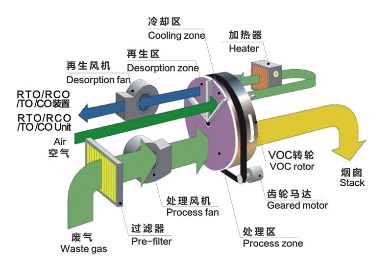 吸附濃縮處理技術(shù)是將吸附濃縮與氧化技術(shù)(包括R TO、RCO、CO) 組合在一起的VOCs治理技術(shù)。吸附濃縮以沸石分子篩或蜂窩活性炭作為吸附材料,以轉(zhuǎn)輪或固定床作為吸附裝置,將大風(fēng)量、低濃度的VOCs廢氣轉(zhuǎn)化成小風(fēng)量、中高濃度的廢氣。