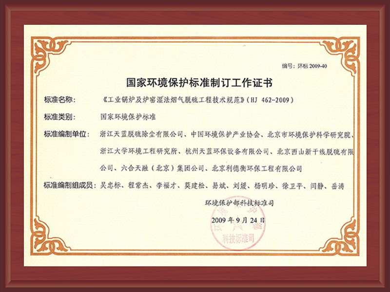 2009年國(guó)家環(huán)境保護(hù)標(biāo)準(zhǔn)制定工作證書(shū)