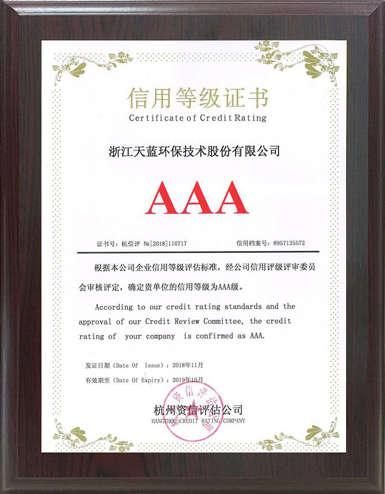 AAA信用等級(jí)證書(shū)2018.11-2019.10